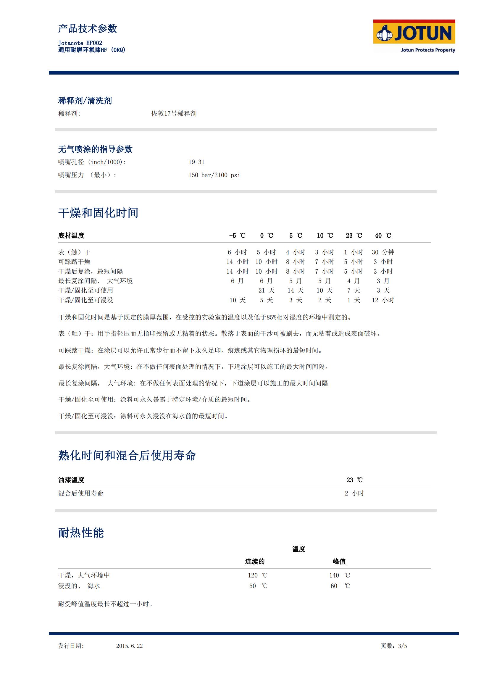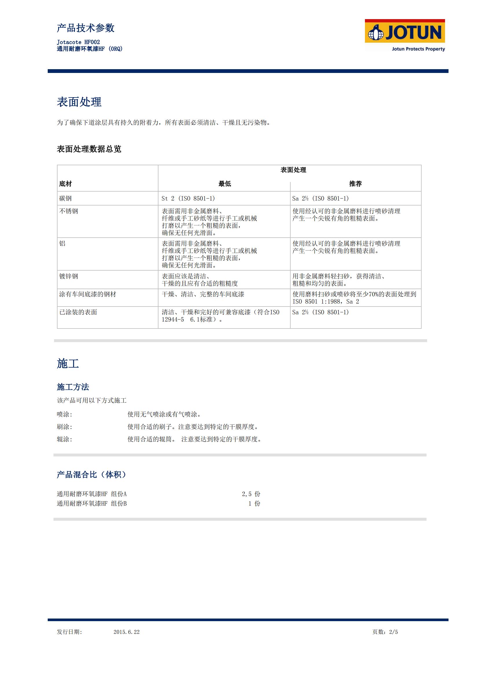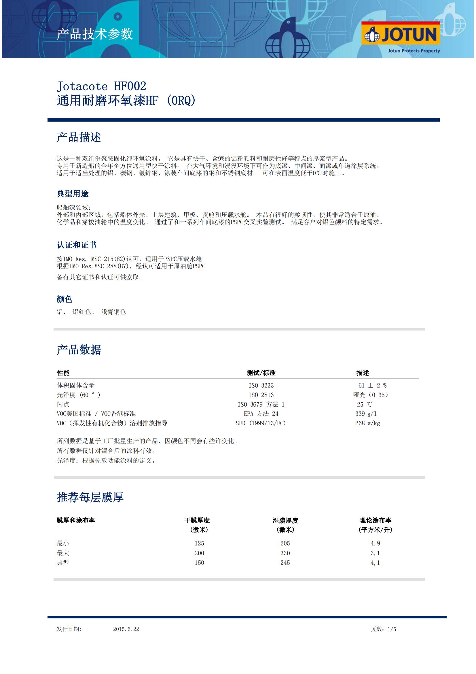 • Jotacote HF002 0RQ:這是一種雙組份聚胺固化純環氧涂料。 它是具有快干、含9%的鋁粉顏料和耐磨性好等特點的厚漿型產品。專用于新造船的全年全方位通用型快干涂料。 在大氣環境和浸沒環境下可作為底漆、中間漆、面漆或單道涂層系統。適用于適當處理的鋁、碳鋼、鍍鋅鋼、涂裝車間底漆的鋼和不銹鋼底材。 可在表面溫度低于0°C時施工。典型用途:外部和內部區域,包括船體外殼、上層建筑、甲板、貨艙和壓載水艙。 本品有很好的柔韌性,使其非常適合于原油、化學品和穿梭油輪中的溫度變化。 通過了和一系列車間底漆的PSPC交叉實驗測試。 滿足客戶對鋁色顏料的特定需求
